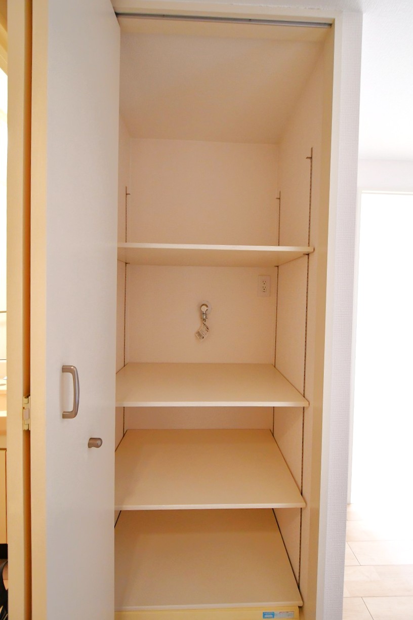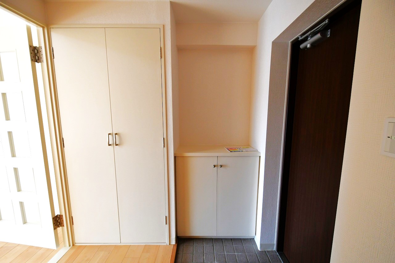 玄関 靴箱の隣に物入があり掃除道具収納に便利です