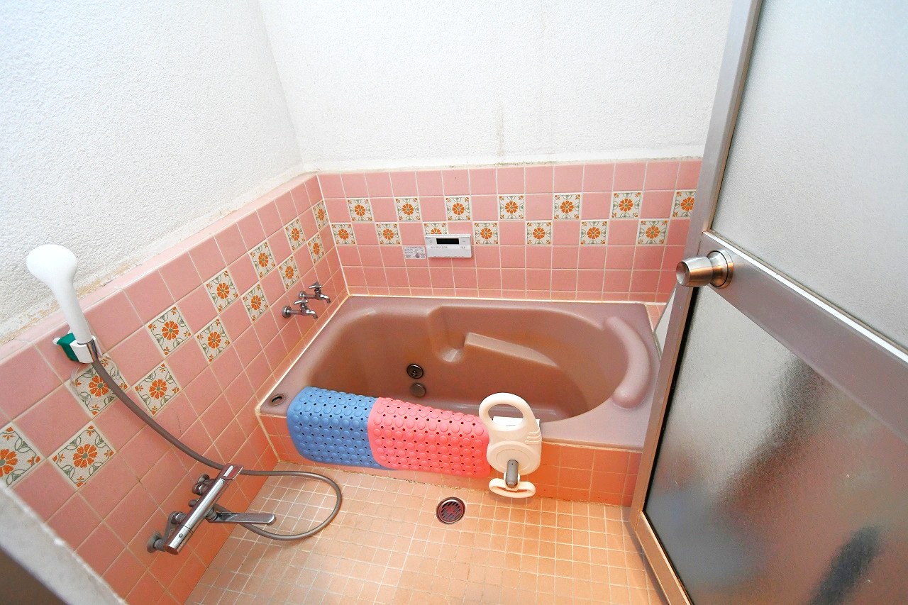 • 家庭用の浴室 ピンクのタイル張りでレトロ感満載