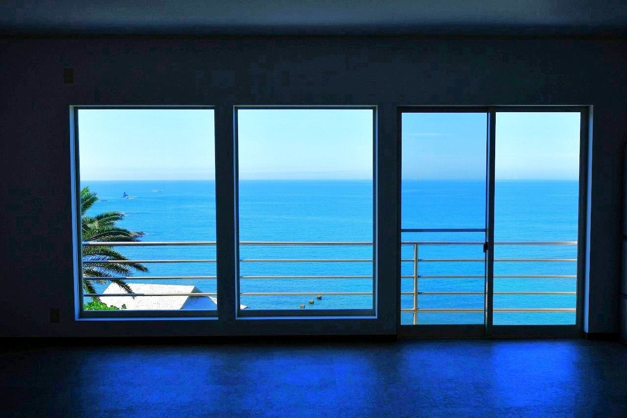 白い外壁が印象的なこの邸宅は、斜面を巧みに活かした2階建て。下駄を履かせたような構造により、1階部分でさえ2階の眺望を、2階部分ではまるで3階からの眺望を楽しめます。窓の向こうには果てしない水平線が広がり、空中に浮かぶ展望台にいるような錯覚を覚えるほど。朝は柔らかな光が海面を照らし、夜には星々が波間に映り込む——そんな幻想的な時間が、ここでは日常になります。