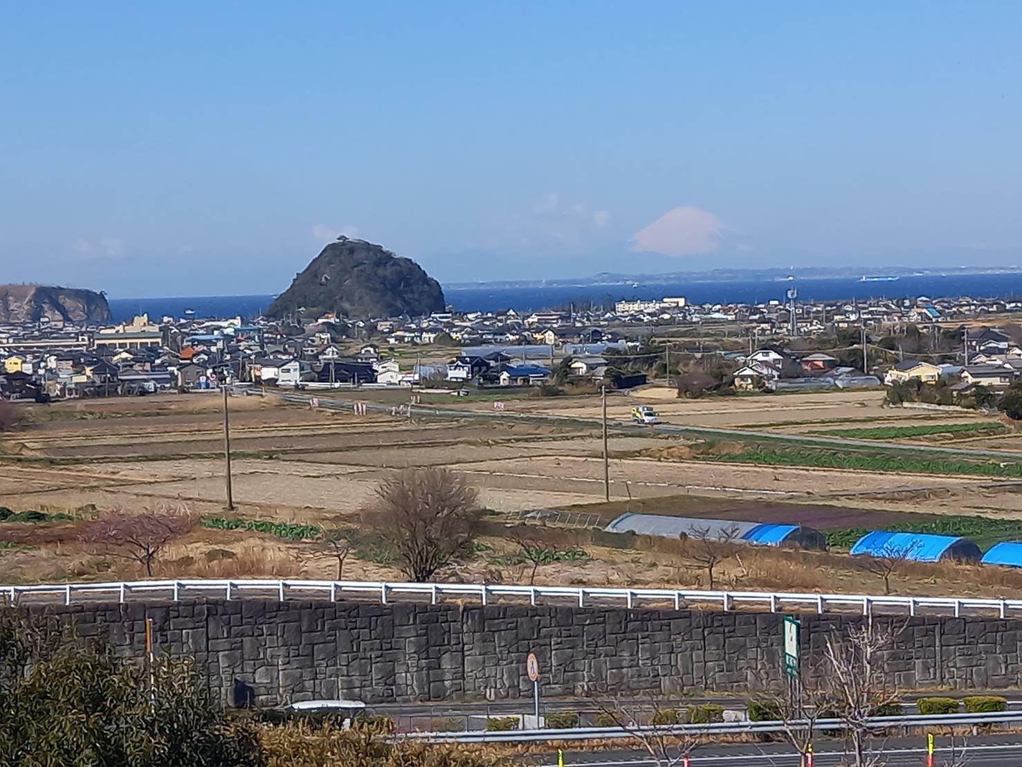 海と正面に富士山が見える丘
