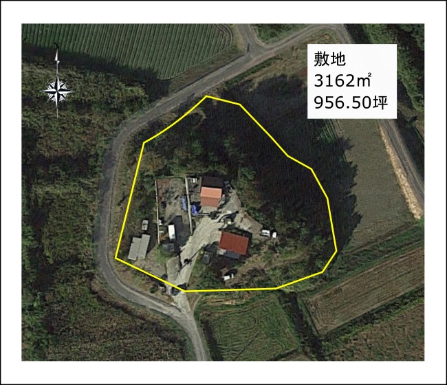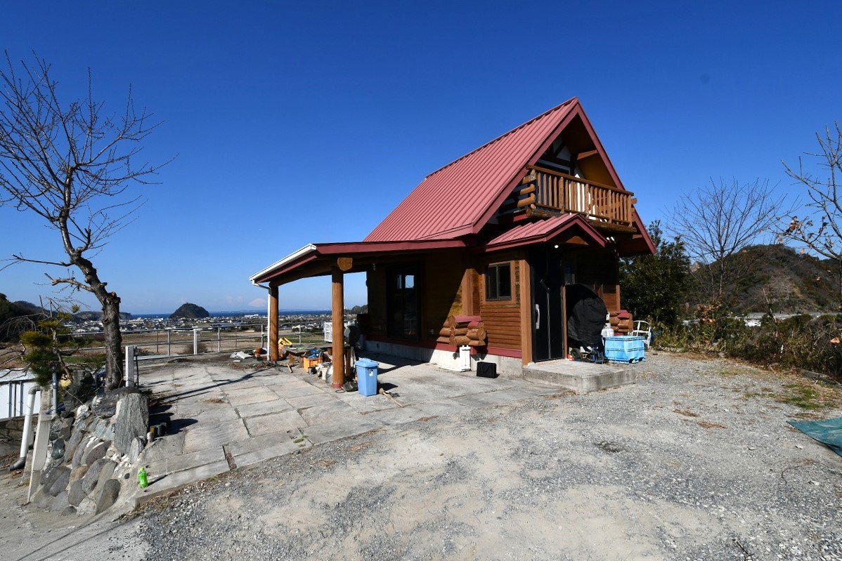 最寄りのインターから車で2分程という近さでありながら山や田畑が広がる里山の中に、ぽっかり現れる丘全体(その上に建つログハウスと倉庫)が物件となります。